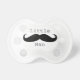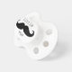 Cute and funny "Litte Man" baby moustache pacifier makes a great baby shower or gift for a new mother. Black and white colours shown with a blue paci for a baby boy.