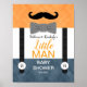 I love this little man baby shower theme welcome sign featuring a mustache, bow tie, and suspenders in an orange and navy blue color scheme. Matching invitation and decorations in store!
