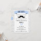 This boy's little man baby shower invitation features a cute black mustache and a grey and white chevron pattern background. The design also includes a light blue ribbon banner at the top and a light blue sash across the middle on the back of the invitation. This invitation is suitable for a boy's little man, mustache baby shower.