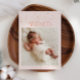 Modern Christmas theme birth announcement card featuring a typography text that says "a little miracle arrived" with your newborn picture. This is a birth announcement card for the holiday seasons! Add your pictures, birth stats, and a message! The background is peach.