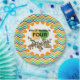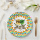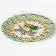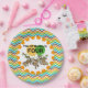 Little Monkeys 4th birthday party paper plates features three monkeys that are oh so cute, swinging from a tree branch, birthday balloons of yellow and green, text that reads This Lil' Monkey is FOUR, and has a wide border of chevron stripes in aqua blue, lime green, orange, brown, and white!