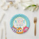 little monster first birthday party plates with cute monsters and blue chevron background.