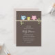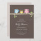This baby shower invitation features a charming illustration of cute and colorful owl characters sitting on a tree branch. The background color is a dark brown which gives a natural and rustic feel to the design. The owls are illustrated in different colors like pink, blue and yellow, adding a pop of color to the design. The design is perfect for a baby shower and will delight your guests. The illustration is sure to catch the attention of your guests and make them excited for the upcoming celebration. The invitation is perfect for a nature-themed or owl-themed baby shower.