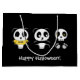 Two little pandas sitting in the dark with a tiny skeleton. One Panda is wearing a yellow tee shirt with the word "meh" on it.
