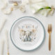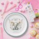 Sweet little peanut theme watercolor elephant enchanting illustration blue baby shower paper plates. Picture a delicate card adorned with the gentle strokes of watercolor, showcasing a charming elephant at its centre. This adorable creature is lovingly surrounded by an array of blossoms and lush foliage, creating a whimsical and inviting scene. The type is multi coloured and chosen for a touch of whimsy creating a rhythm between type and image and soft pastel colours in the imagery and typography. Perfect for a spring or summer baby shower celebration.