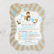 Sunburst baby blue and kraft texture background and bunting banner with baby in peanut shell carnival theme baby shower invitation card design.
