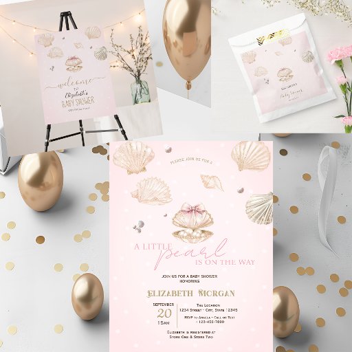 Our little pearl is on the way! Announce your upcoming baby shower with seashells, a pink bow, and pearls on polka dots. Perfect for an ocean or beach-themed baby shower.