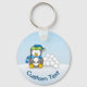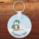 A little penguin cartoon sitting and holding a snowball. Custom text on both sides.