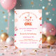 Celebrate your little one's first birthday with this cute pig-themed party invitation! Featuring a smiling piglet in a party hat surrounded by candy and confetti, this pink and orange birthday invite is perfect for baby girls turning one. Customize all text to suit your party details. Ideal for farm-themed, barnyard, or sweet-themed first birthday parties.