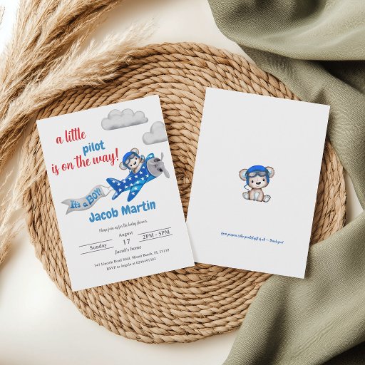 Celebrate your baby boy’s arrival with adorable pilot-themed baby shower invitations. Featuring a cute bear flying a starry blue aeroplane and a cheerful ‘It’s a Boy!’ banner, these cards are perfect for adding fun and charm to your special day. Personalise with your event details and get ready to make your guests smile!
