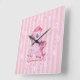 Personalize this wall clock printed with a cute pink pony on a striped background for a child with her name. Available in square or round style. Created with artwork by Angela Wenke at www.resaleclipart.com.