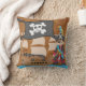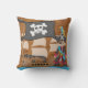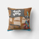A boy pirate with brown hair wears a hat with a parrot sitting on the brim. A pirate ship complete with canon and a skull and crossbones flag on a pillow your little pirate is sure to love!