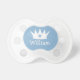 Stylish custom baby pacifier for your little prince features a crown with star accent and text that can be personalised with baby's first name or other wording. Makes a great baby shower gift or gift for a new mother. Blue and white design colours.