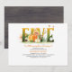 Little pumpkin 5 birthday party invitations with orange and white pumpkins, colourful fall leaves, sunflowers, wheat, and autumn berries