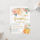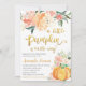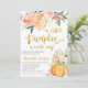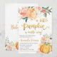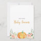 The invitation features an orange pumpkin with blush pink and orange flowers. This design is perfect for a fall-themed baby shower.