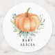 This baby shower confetti features a watercolor pumpkin, fall greenery foliage and green watercolor background.
