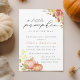 Custom-designed fall baby shower invitation featuring "a little pumpkin" modern hand calligraphy with elegant fall floral and little pumpkins design.