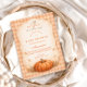 A warm and cozy fall baby shower design featuring a hand-painted watercolor pumpkin surrounded by soft peach florals, golden leaves, and delicate autumn accents. The earthy orange palette and elegant arch layout create a refined harvest aesthetic that feels timeless and inviting. Perfect for an autumn celebration, a neutral fall theme, or a charming “Little Pumpkin” baby shower with rustic floral details.