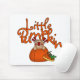 A little ragdoll with red yarn hair pigtails peeks from inside a big orange pumpkin and pumpkin coloured text that reads "Little Pumpkin" is featured on Halloween T-shirts, mousepads, trick or treat bags, mugs, and more.