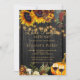 Rustic farmhouse style autumn baby shower invitation in dark brown barn wood with gold typography script and strings of twinkle lights featuring beautiful sunflowers, an orange watercolor pumpkin, dried leaves and foliage and two glasses of red wine. +++++++++++++ Suitable for fall gender neutral baby shower, gender reveal parties or sprinkles.