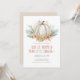 Coastal, fall theme birthday party invitation features a watercolor pumpkin surrounded by starfish and sand dollar sea shells, coral, and palm and eucalyptus greenery. The "Our Little Pumpkin Is Turning 1" caption can be personalised and the earth-toned autumn colours are perfect for a girl or boy.