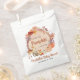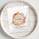 Rustic autumn-themed baby shower favour bags featuring a watercolor illustration of a wreath composed of a tree trunk adorned with cute woodland animals (owl, deer, squirrel and fox), fall florals and orange pumpkins. A "Sweet Little Pumpkin Is On Its Way" is written in a mix of simple typography and a terracotta script. Specify the baby's gender if desired (e.g., "is on his way").
