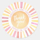 This round sticker design features a vibrant sun at the centre, with the cheerful phrase "Thank You!" placed right on top. The sun's rays shine in warm shades of yellow, orange, pink, and red, adding a bright and joyful touch to your baby shower.
