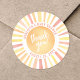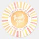 This round sticker design features a vibrant sun at the centre, with the cheerful phrase "Thank You!" placed right on top in a warm orange-red font. The sun's rays shine in classic shades of yellow, orange, and a hint of red, adding a bright and joyful touch to your baby shower.