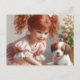 This image shows a young child and a small, fluffy puppy sitting on the floor. The child’s face is happy, and she is wearing a pink dress with white lace details and has red hair tied with white bows. The puppy, which has brown, black, and white fur, looks playful with its tongue visible. In the background, there’s a wicker basket containing flowers and foliage.