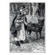 This notecard has a vintage black and white drawing of little red riding hood meeting up with the big bad wolf in the woods under the trees.