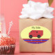 A cool little red wagon with a black handle and wheels. A yellow background and a border of red and blue stripes with little yellow stars.