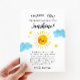 Cute sunshine theme baby shower thank you template card featuring watercolor illustration of a smiling sun with stars and clouds. The text says "Thank you for showering our little sunshine!" The default message thanks the guests for attending the shower and for the gift. Gender neutral design.