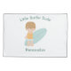 Cute little surfer boy with a surfboard personalised pillowcase. "Little Surfer Dude" Personalise with name, initials, message or any quote you desire. A baby blanket is also available in this theme and design.