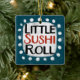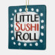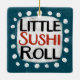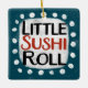 A cute typographic food design that says "Little Sushi Roll". It's black and red text on a white rectangle with funky, playful white dots surrounding it, all on a teal background.
