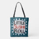 A cute typographic food design that says "Little Sushi Roll". It's black and red text on a white rectangle with funky, playful white dots surrounding it, all on a teal background.