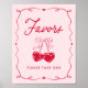 This sweetheart-themed favors sign features a soft pink background and a Valentine-inspired design for a baby shower favors table. “Favors” is shown in a handwritten red script, with red heart-shaped cherries tied with a bow displayed beneath the lettering. Guest instructions appear below, shown as “Please Take One.” A hand-drawn red ribbon frame accented with small heart details surrounds the layout, tying the sign into a sweetheart-themed baby shower décor style.