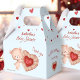 A little sweetheart is on the way! Bring the most adorable feeling to your baby shower with this darling baby bear themed favour boxes in red, light blue and beige with an adorable baby bear holding a sweet heart shaped cookie, little hearts on the top. Just perfect for your February boy baby shower. Easily personalise the text or leave some of it blank. - Kate Eden Art