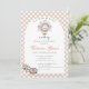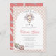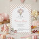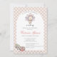 Fall & Thanksgiving Baby Shower Invitation for a baby girl. Features a cute hand-drawn baby girl turkey and pie on an adorable gingham background. Back is printed with a scattered gingham feathers pattern.
