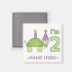 Cute green turtle with yellow hearts on shell, purple birthday hat and candle on this second birthday design.