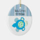 A soft coloured ornament featuring a baby turtle in blue and green a soft blue striped background accents it. Customise as desired.