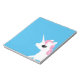 A notepad featuring an adorable vector illustration of a white Unicorn with a flowing pink mane on a blue background.