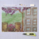 Blooming tree with falling blooms amidst barrels and a little wagon are presented in this hand-drawn mixed media artwork, a reminder of late Spring.