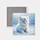 Adorable fluffy white kitten with blue eyes playing outside on a winter day in the snow. Ai generated art.