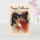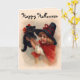 Delightful vintage art features a little Witch girl in pointed black hat and red cape with her cute black kitten. Happy Halloween text can be customised by you.