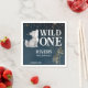Little wolf themed birthday party wild one personalised napkins , cute howling wolf pup dark starry night background.