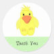 A cute little yellow duck with a big orange beak and a cute expression. A soft green border with white dots.