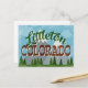 Littleton Colorado neo vintage travel poster wall art in cartoon retro style. It features snowy mountains and forest below with fun and happy retro text.