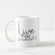 Live In The Moment Quote Coffee Mug. Simple black and white typography on coffee mug. Start your day inspired by this quote while drinking your morning coffee or tea. Design by Jenn's Emporium.