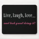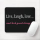 Live, Laugh, Love Black Computer Mousepad. This mousepad is black with white and pink lettering that reads, "Live, laugh, love...and look great doing it!"