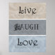 Live, laugh, love saying in colourful neutral blue, tan, & grayish tones with pinstripes (centre)& a swirl pattern, in the background.